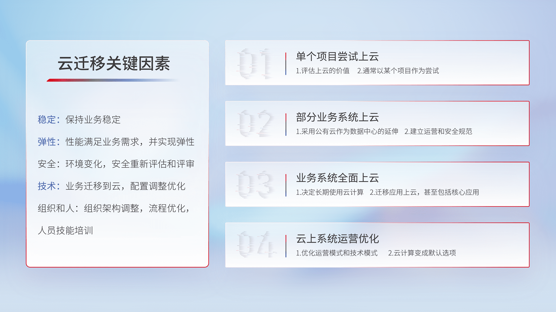 结合实际业务,,,从规划设计、、云平台选型、、、云原生改造、、、、数据迁移、、、、集成交付,,,迁移全过程为客户识别最佳上云路径,,做好风险识别管理,,,设计网络架构、、、身份权限、、、、安全审计合规、、操作审计、、、日志审计、、、、监控告警策略、、、多站点容灾设计等,,,,对云上基础设施进行整体规划,,提升IT治理水平,,,以满足弹性、、高可用、、、高性能的需求。。